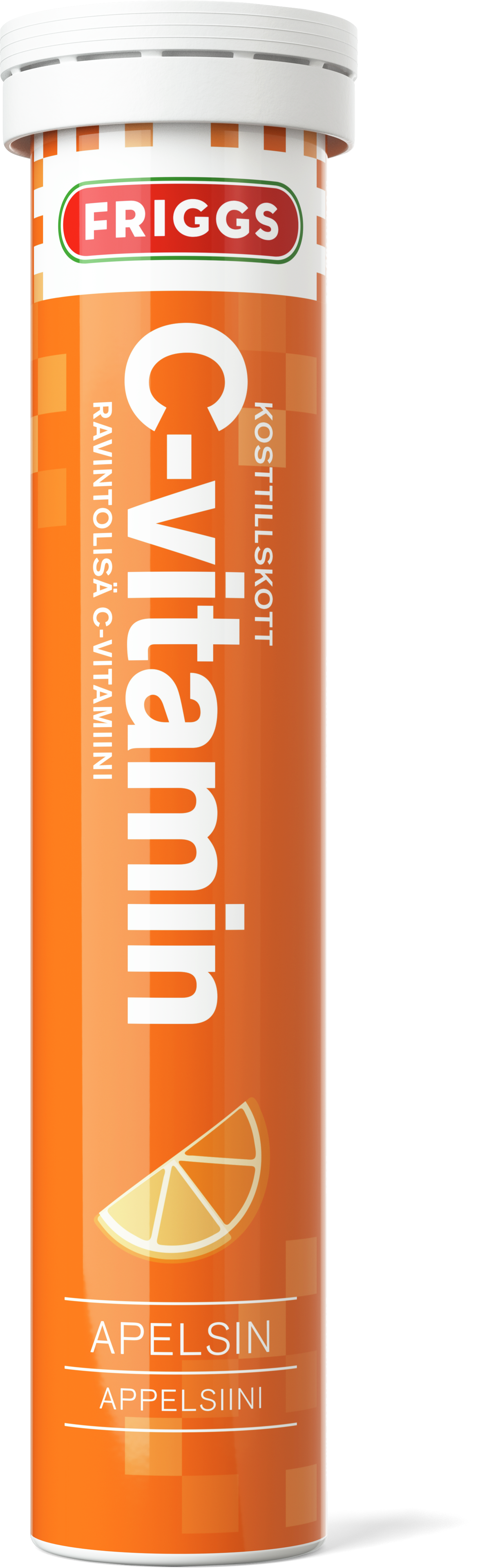 Friggs C-vitamiiniporetabletit Appelsiini ovat sokerittomia ja nopeasti liukenevia. 1 tabletti sisältää 1g C-vitamiinia. C-vitamiini on tärkeä vitamiini, joka suojaa elimistön soluja. Se edistää mös raudan imeytymistä, on hyväksi iholle, luustolle, hampaille ja verisuonille sekä edistää immuunijärjestelmän normaalia toimintaa.