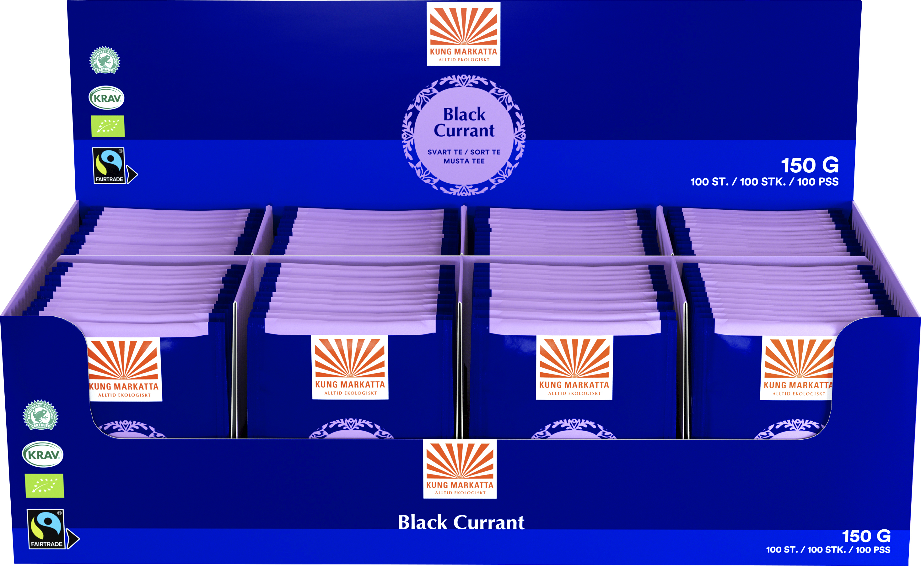 Black tea with a well-balanced taste of Blackcurrant. The tea is Organic, Rainforest alliance and Fairtrade certified and full fill requirements in accordance with EU2018/848 organic production and labeling of organic products. Tea bags are made from paper, packaged in climate smart envelopes and climate compensated. Practical display solution.