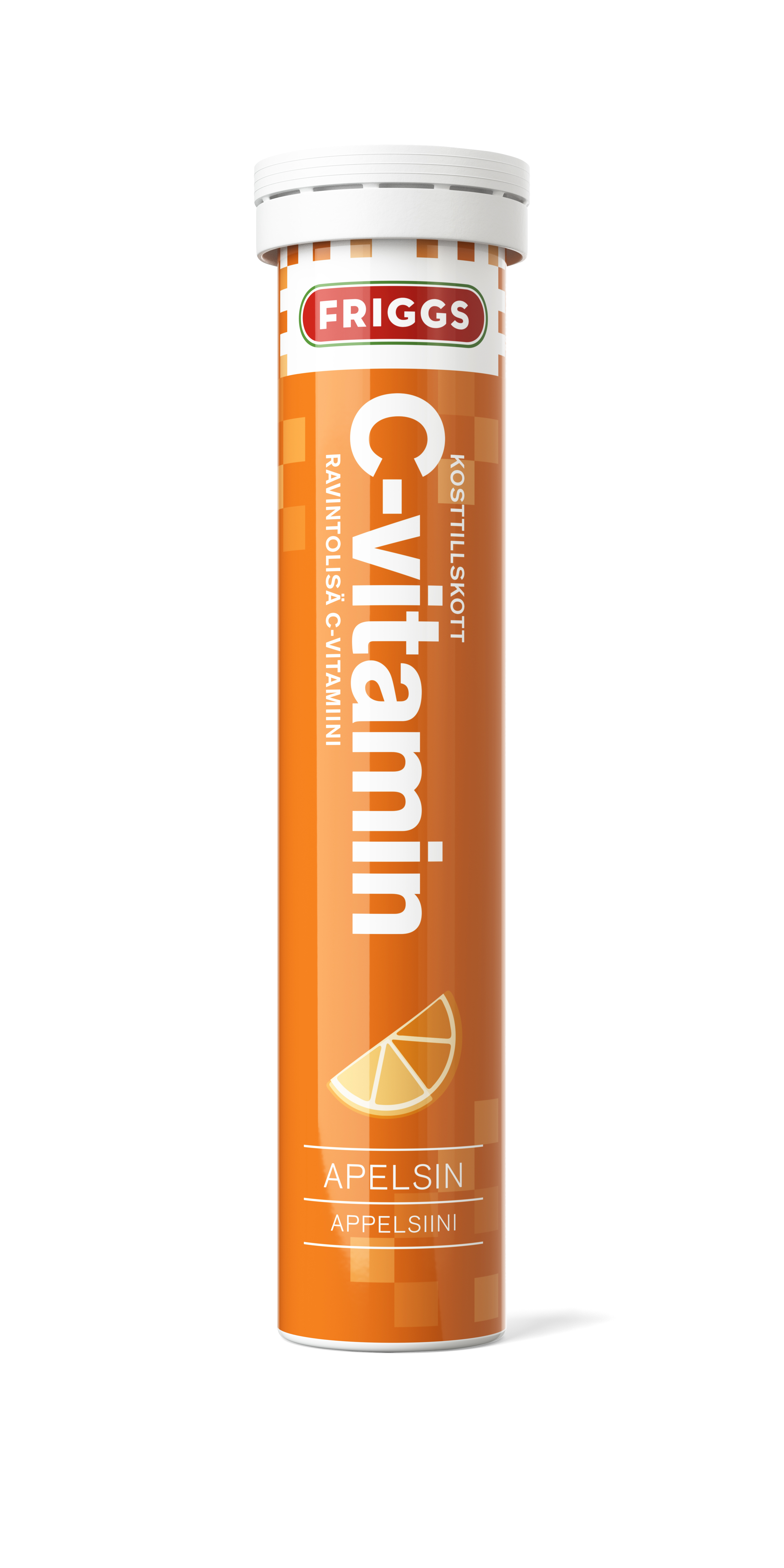 Friggs C-vitamiiniporetabletit Appelsiini ovat sokerittomia ja nopeasti liukenevia. 1 tabletti sisältää 1g C-vitamiinia. C-vitamiini on tärkeä vitamiini, joka suojaa elimistön soluja. Se edistää mös raudan imeytymistä, on hyväksi iholle, luustolle, hampaille ja verisuonille sekä edistää immuunijärjestelmän normaalia toimintaa.